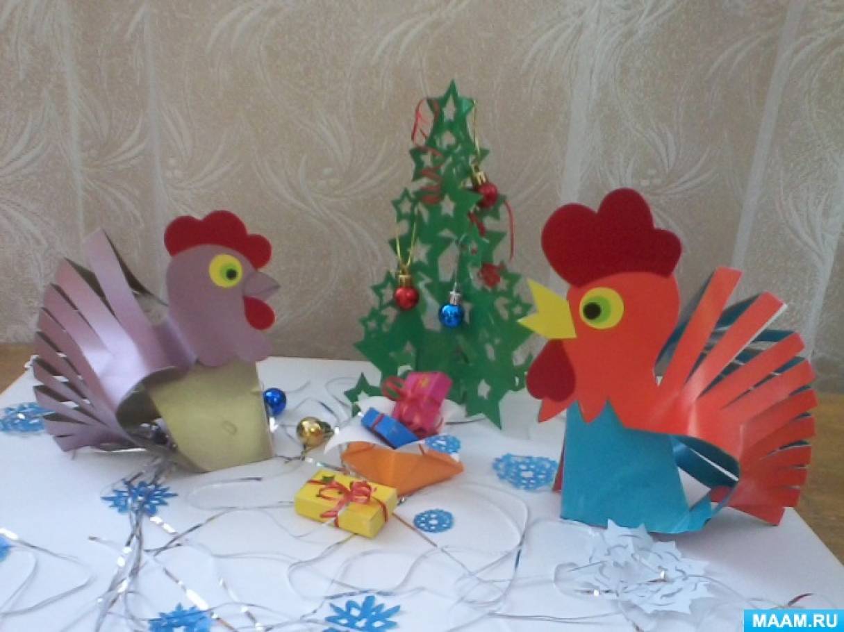 В ожидании нового года мы с дочкой решили сделать свой мастер-класс по изготовлению новогодней поделки. А свою поделку решили назвать "Петя, Петя, петушок - в гости он Вас всех зовёт!" Вначале мы хотели сделать только петушка, а потом решили и курочку сделать, затем добавили елочку, а так как это новогодняя поделка, да ещё петушок всех в гости приглашает, значит - обязательно нужны подарки, новогодний "дождик", и елочные украшения с ёлочкой. Для изготовления поделки приготовили:картон,цветную бумагу,бархатную бумагу, клей-карандаш, салфетку, ножницы, елочные украшения, оберточную ленточку, простой карандаш. ![]() ![]() ![]() ![]() ![]() ![]() Затем из картона, цветной бумаги и бархатной бумаги принялись изготавливать петушка и курочку. ![]() ![]() ![]() ![]() Сложили картон пополам, начертили на одинаковом расстоянии полоски, нарисовали голову петушка и курочки, вырезали ножницами,украсили цветной бумагой и бархатной бумагой. ![]() ![]() Затем приготовили заготовки для ёлочки. Ёлочку решили сделать из "звёздочек"- по шаблону, их нам понадобилось четыре штуки. ![]() ![]() Из цветной бумаги сделали коробочку способом "оригами". ![]() В коробочку сложили "подарки". Их изготовили из цветной бумаги, украсили обёрточной ленточкой. ![]() ![]() Как только всё было готово, собрали всю свою композицию, украсили ёлочку ёлочными игрушками, обёрточной ленточкой, добавили немного снежинок, которые вырезали из белой и голубой бумаги. ![]() ![]() ![]()